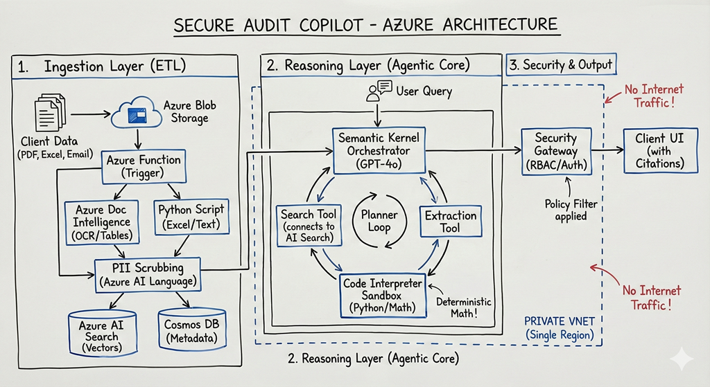 A high level architecture reference of an end-to-end secure, Copilot – which uses LLM,RAG, Agents, Security etc. on Microsoft/Azure stack